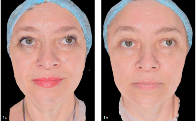 После проведения курса процедур отмечается сокращение числа и выраженности морщин и борозд, повышение упругости кожи, уменьшение выраженности сосудистого рисунка в области щёк и подбородка [Фото 1b]. Далее планируется комплекс аппаратных и инъекционных процедур с целью коллагеностимуляции. Будет логичным для поддержания ответа дермы проводить процедуры с использованием препарата Collost micro в промежутках между вышеуказанными воздействиями.