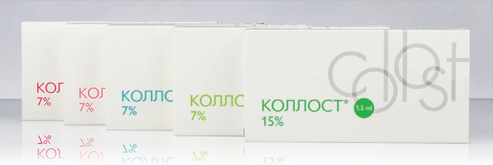 репараты на основе коллагена применяются в российской эстетической медицине с 2005 г., уже почти 20 лет, когда для дерматологии был зарегистрирован препарат Коллост®. Этот продукт успешно используется врачами для коррекции дряблости и атрофии кожи, в лечении рубцовых деформаций и для подготовки к агрессивным воздействиям, например, лазерной шлифовке. Первоначально препарат появился в форме гелей 7% и 15% различного объема, содержащих нативный нереконструированный коллаген I типа. Волокна коллагена в данном препарате создают опору для направленного движения фибробластов, позволяют клеткам дермы в полной мере осуществлять свою основную синтетическую функцию, обеспечивают условия для обновления и омоложения межклеточного вещества. Введенный коллаген I типа в составе препарата Коллост® служит, во-первых, матрицей для направленной тканевой регенерации и, во-вторых, является строительным материалом для синтеза собственного коллагена.